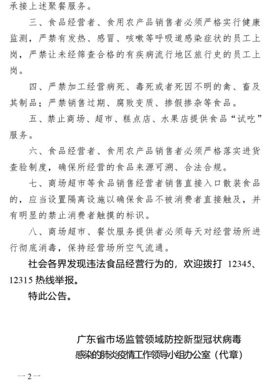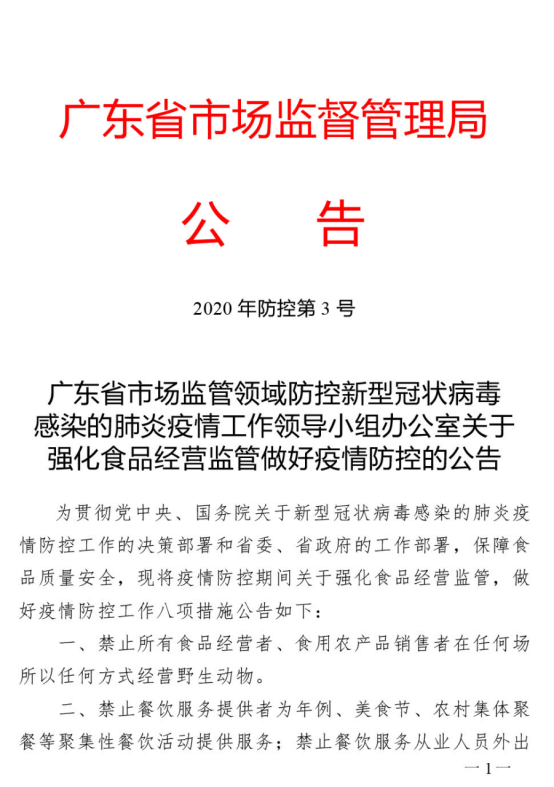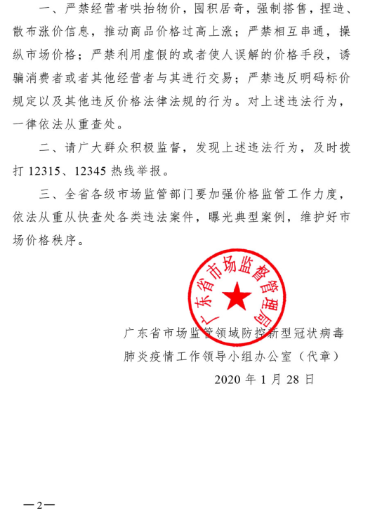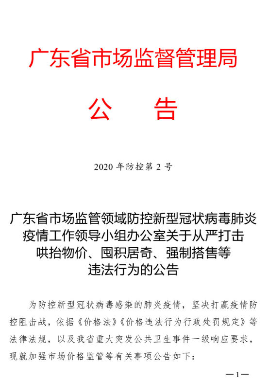 廣東省市場監管領域防控新型冠狀病毒肺炎疫情工作領導小組辦公室關于從嚴打擊哄抬物價、囤積居奇、強制搭售等違法行為的公告