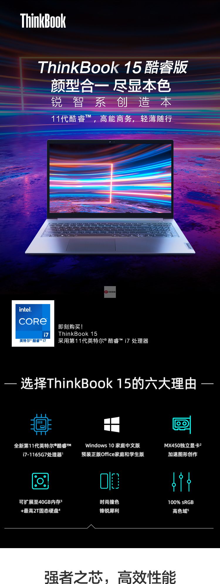 商品名稱:聯(lián)想ThinkBook 15 2021款 酷睿版 英特爾酷睿i7 15.6英寸輕薄筆記本(i7-1165G7 16G 512G MX450獨顯 高色域)