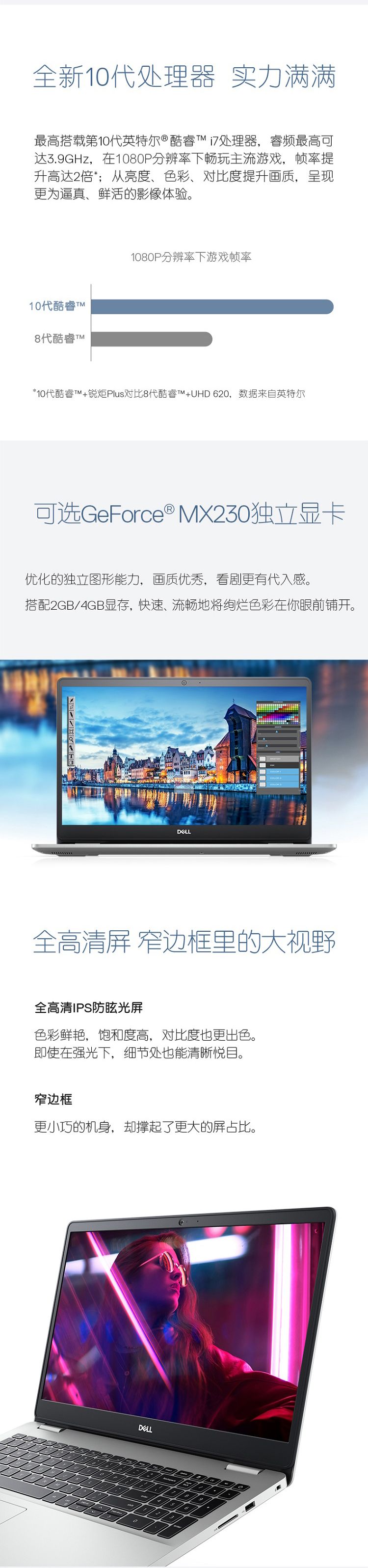 自營戴爾DELL靈越5000 酷睿i5 15.6英寸網課學習輕薄筆記本電腦(i5-1035G1 8G 512GSSD MX230 2G獨顯)銀