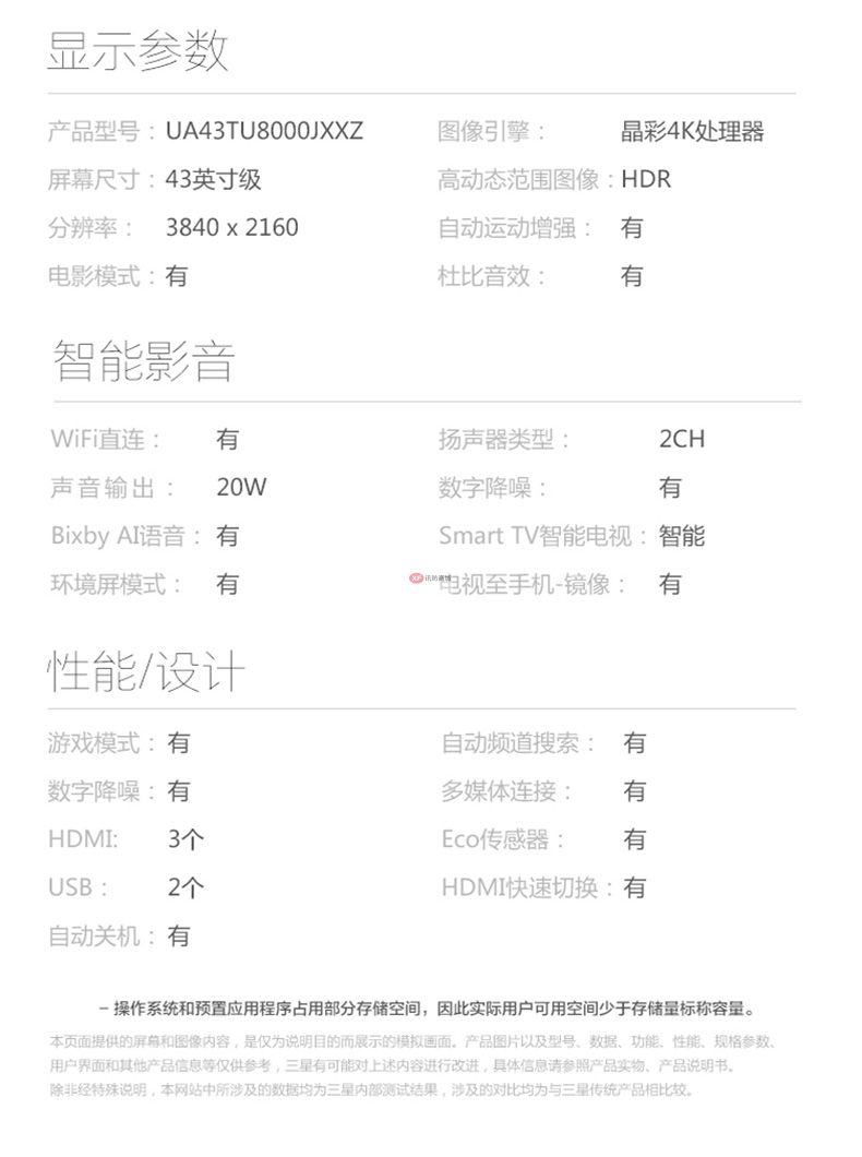 商品名稱:三星(SAMSUNG) UA43TU8000JXXZ 43英寸 TU8000 4K超高清 全面屏 HDR畫質增強 教育資源智能液晶電視機