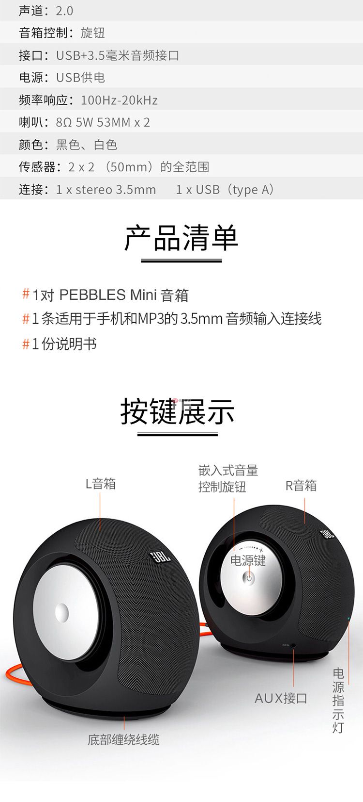 商品名稱:JBL 電腦小音響 Pebbles mini USB連接 2.0聲道