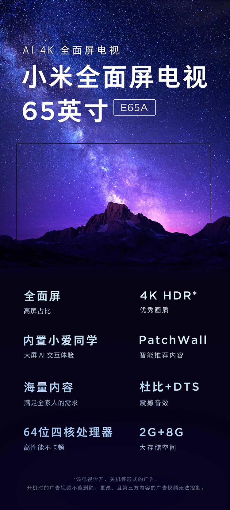 自營小米(MI) L65M5-EA 全面屏電視E65A 65英寸 4K超高清 HDR 內(nèi)置小愛 藍(lán)牙語音 2GB 8GB AI人工智能網(wǎng)絡(luò)液晶平板電視L65M5-EA (65英寸 小米電視E65A)