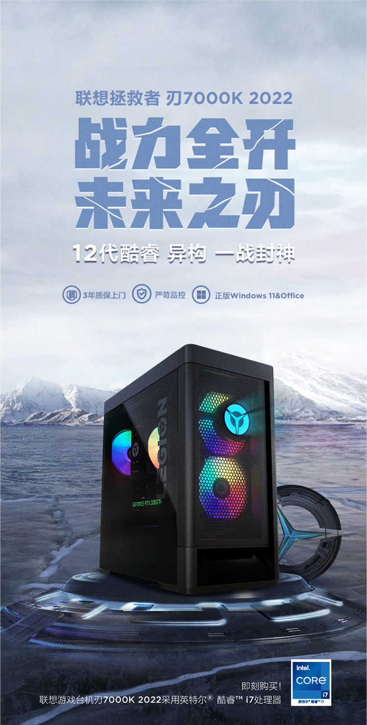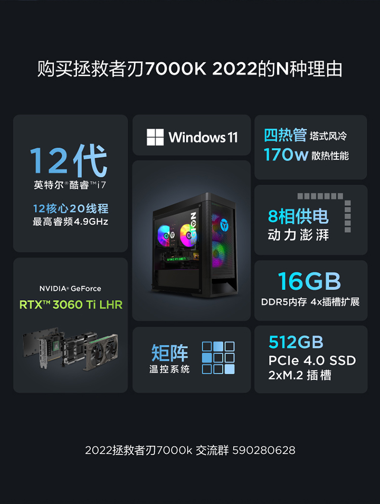 自營?聯想(Lenovo)拯救者刃7000K 2022游戲電腦主機(12代i7-12700F RTX3060Ti LHR顯卡 16G DDR5 512G SSD)