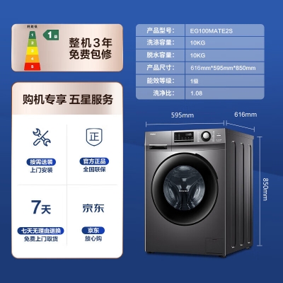 自營海爾(Haier)滾筒洗衣機全自動家電 BLDC變頻電機 10公斤大容量 雙重殺菌99% EG100MATE2S