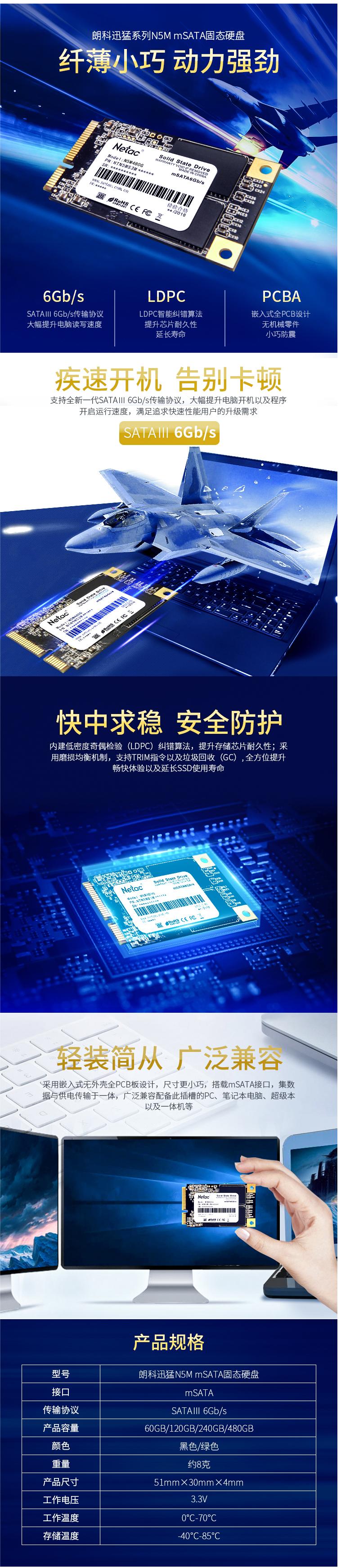 商品名稱:朗科(Netac) N5M 480GB 固態硬盤 MSATA3.0接口 讀速400MB/s 纖薄小巧 動力強勁