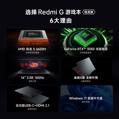 自營小米 Redmi G 游戲本 筆記本電腦(R5-6600H 16G 512G RTX3050 2.5K 165hz高刷屏 高色域電競屏)