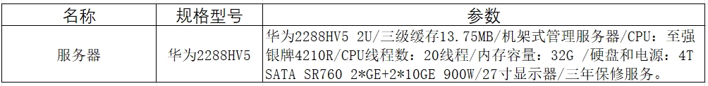 商品名稱:華為2288HV5 2U/三級緩存13.75MB/機架式管理服務器/CPU:至強銀牌4210R/CPU線程數:20線程/內存容量:32G /硬盤和電源:4T SATA SR760 2*GE+2*10GE 900W/27寸顯示器/三年保修服務