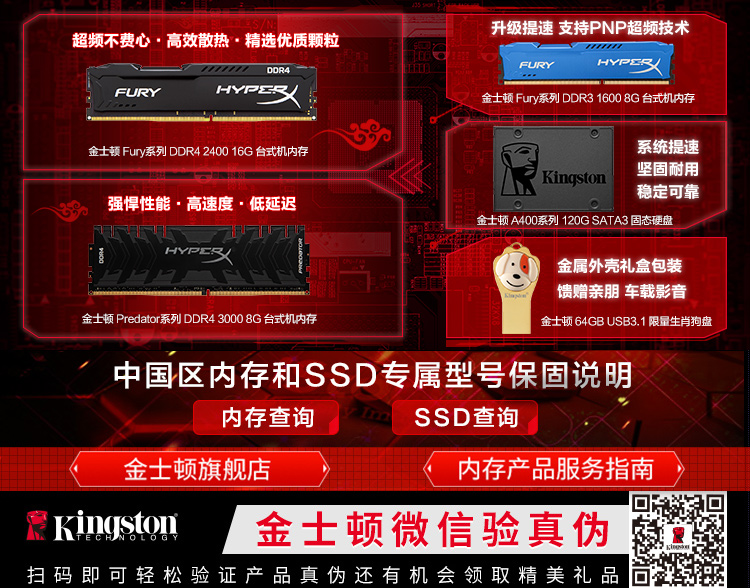 自營金士頓(Kingston)駭客神條 Fury系列 DDR4 2400 16G 臺式機內存