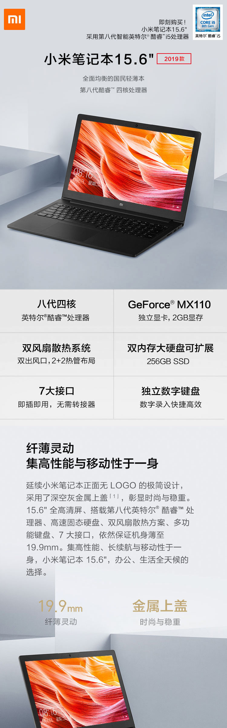 自營小米 (MI)Ruby 2019款 15.6英寸金屬輕薄筆記本電腦(第八代英特爾酷睿i5-8250U 8G 256G SSD 2G GDDR5獨顯 FHD 全鍵盤 Office Win10) 深空灰